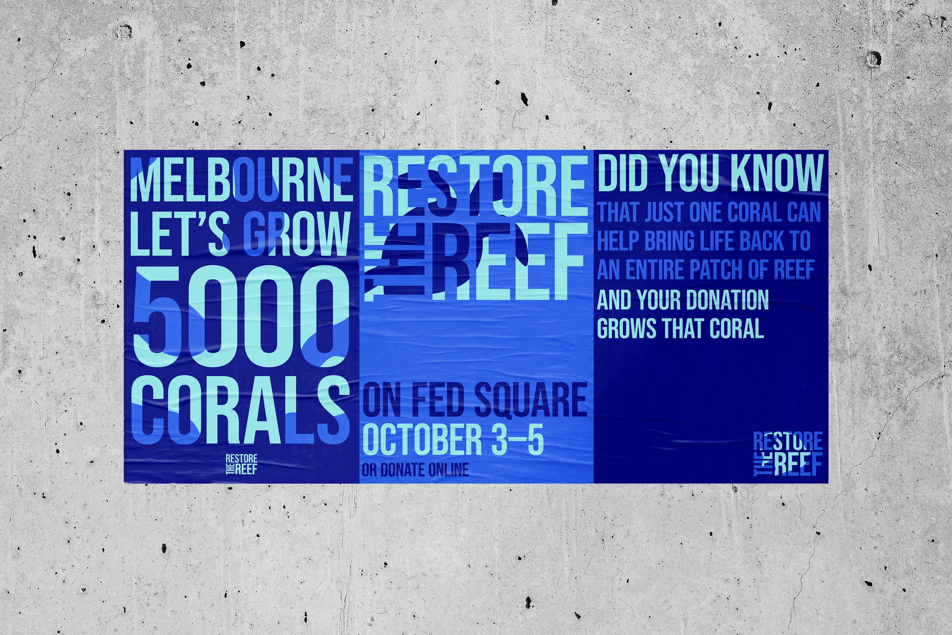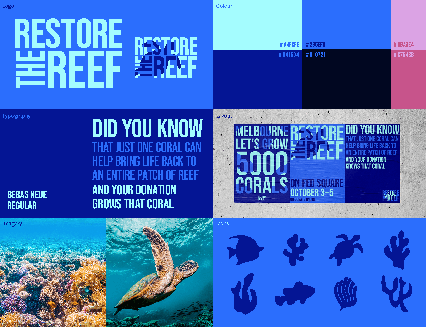 The campaign design draws from the underwater world, using a vibrant palette and bold typography to demand attention. Icons and imagery depicting reef life add emotional connection, highlighting what’s at risk.