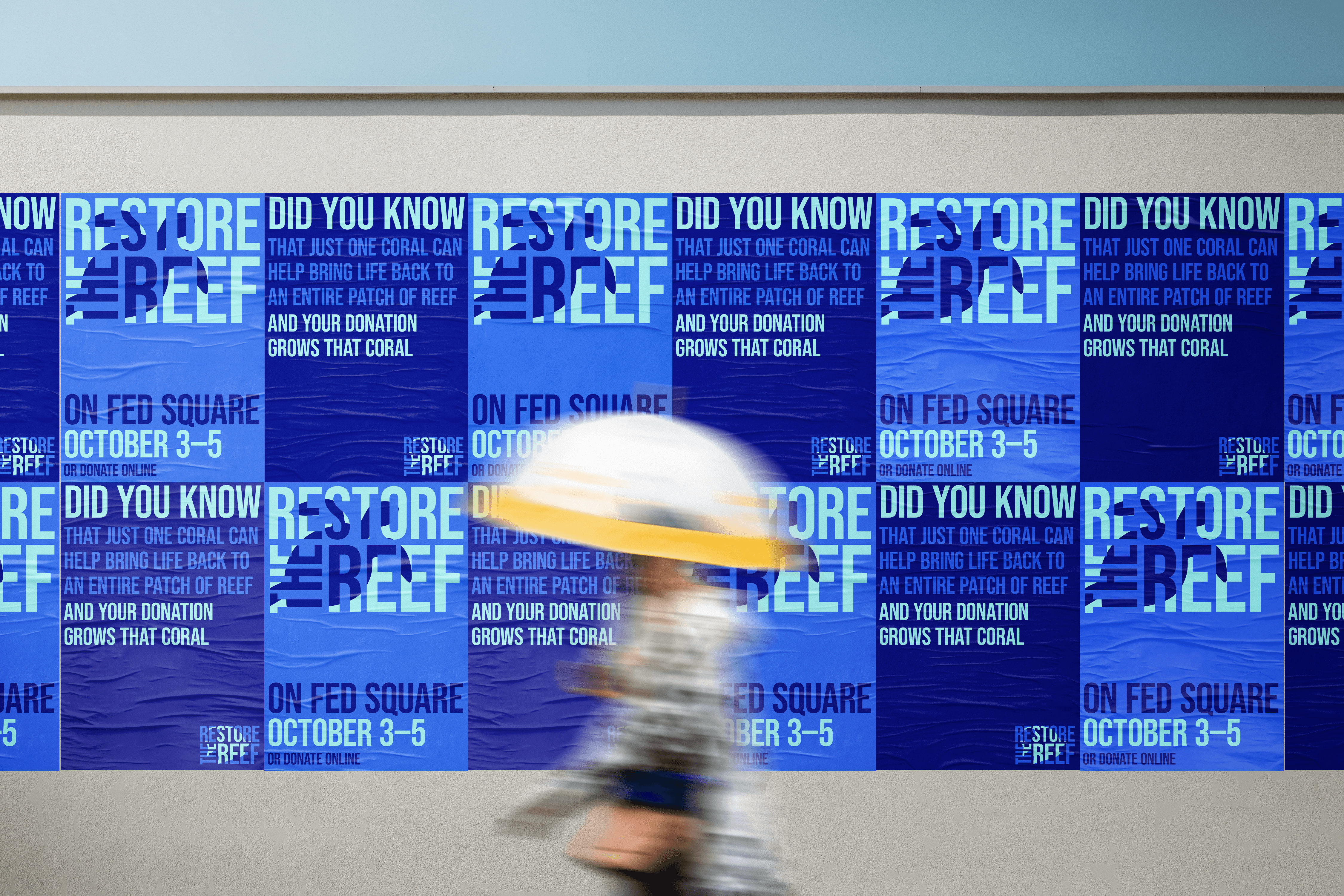 Restore the Reef is a touring fundraising campaign built around visual impact and public engagement. A large, interactive reef installation appears in busy city locations, inviting people to step closer and participate. Initially grey and lifeless, the installation gradually regains colour as donations increase.